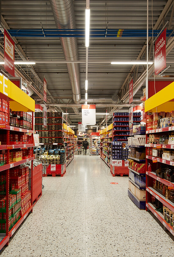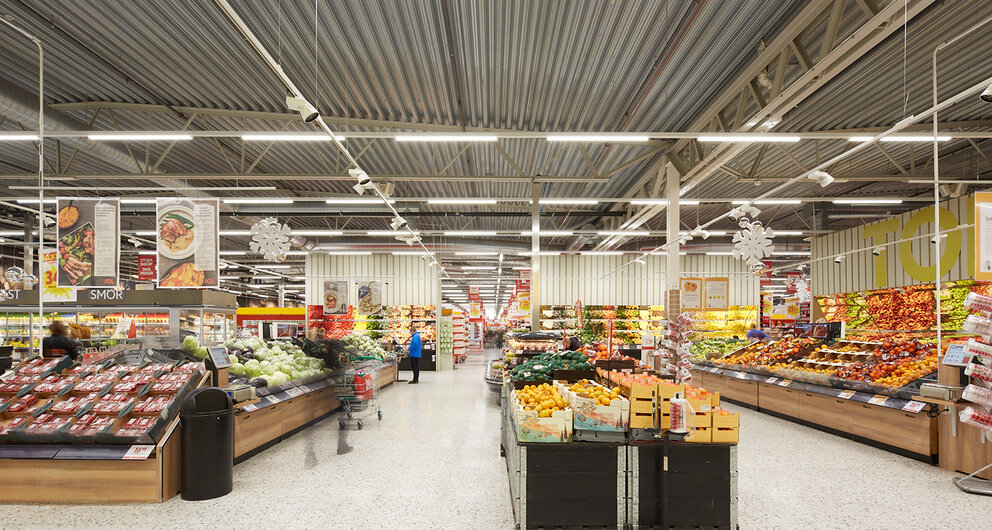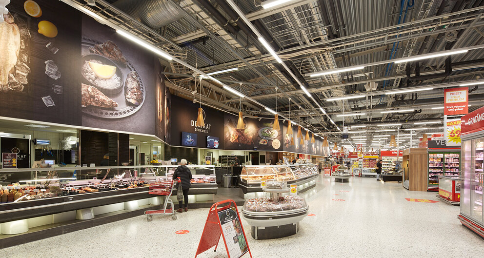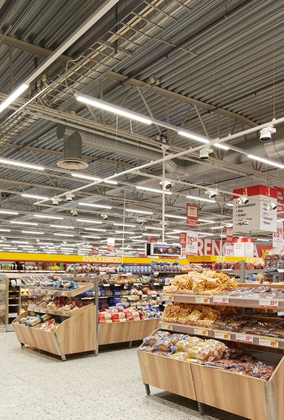 If you want satisfied customers, you must make shopping an experience. Lighting solutions from SITECO support this approach at the same time improve energy savings and create the best balance between the two with modern solutions - at ICA Maxi store Flygstaden in Halmstad, Sweden. Here, the Licross® trunking system has replaced the old lighting with T5 fluorescent tubes. These had only managed a mediocre light level and were simply mounted in rows - inflexible and completely detached from the store layout. Thanks to SITECO, the store is now much brighter. Optional dimming not only saves energy, but also offers the opportunity to deliberately illuminate individual surfaces and areas. The well-lit aisles help with orientation in the store, and the friendly atmosphere invites customers to stay a while. Rich colors for fruit and vegetables stimulate the appetite.