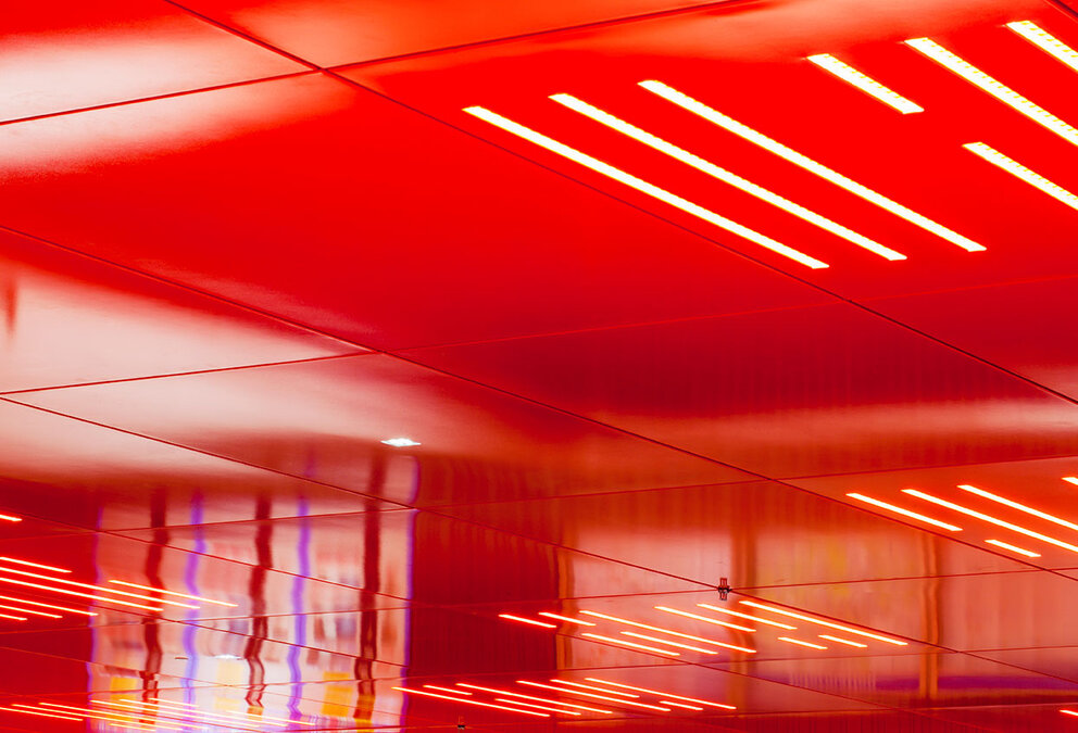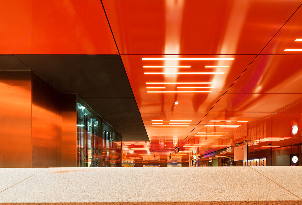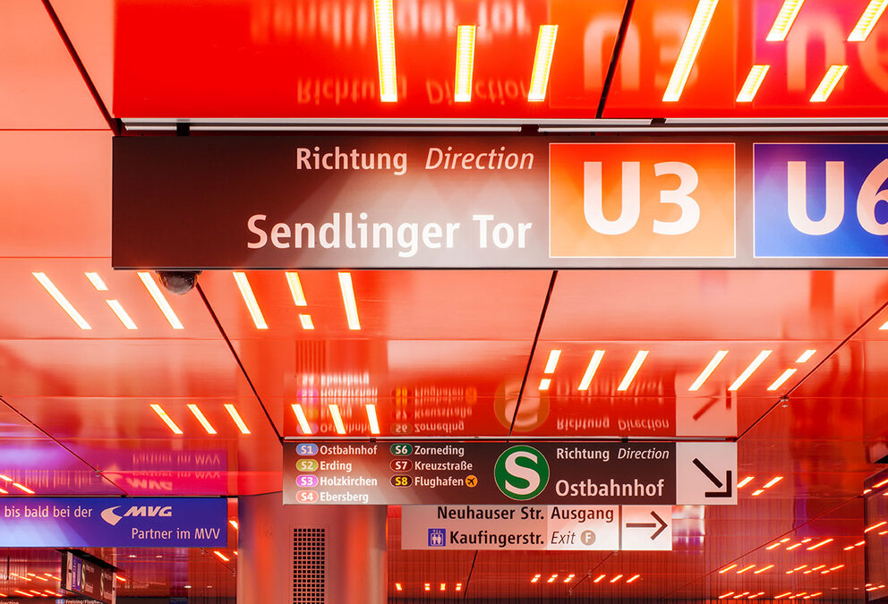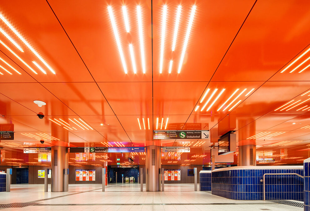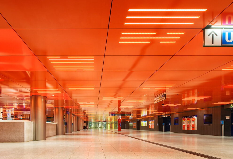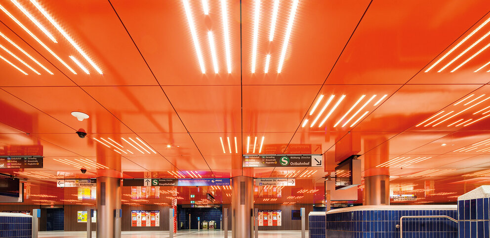 Clear and bright – this is new look of the renovated mezzanine floor at Munich's Marienplatz underground and suburban railway station, one of the most important hubs in Munich's public transport system that serves up to 200,000 passengers per day. The central design element is the orange-red, slightly reflective ceiling. The project involved integrating more than 1,000 specially developed LED light lines from SITECO and wallwashers for illuminating signs.