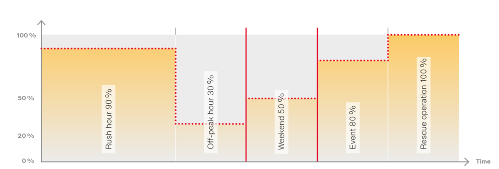 - Switching spontaneously during events. During rescue operations, intervene by pressing a button on the operation system and unscheduled increase to 100% again.