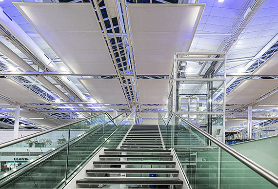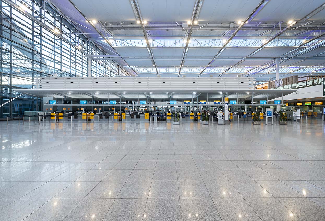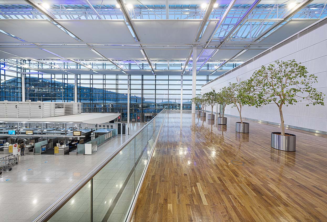 Sophisticated architecture requires special solutions. As a landmark from the air and from the ground, Munich Airport is one of the great figureheads of the Bavarian capital: its architecture embodies cosmopolitanism and innovative strength. Innovative solutions are required to achieve the ambitious goal of operating the airport in a climate-neutral manner from 2030 on. Our lighting solution for Terminal 2 based on SITECO Floodlight FL 20 makes a significant contribution to this goal: 70 % less energy is required and thus saving enormous amounts of CO2. As with the new building in 2003, SITECO was the first choice because its reliability and lighting quality spoke for themselves. In addition to the aim of significantly saving energy, the lighting solution convinces with its unique lighting effect and integrates harmoniously into the architectural ensemble. The special feature: the lighting concept developed by Ulrike Brandi is continued, and the terminal ceiling shines in the white and blue of the Bavarian sky thanks to the combination of the two light colours used, Deep Blue and Neutral White in Floodlight FL 20.
