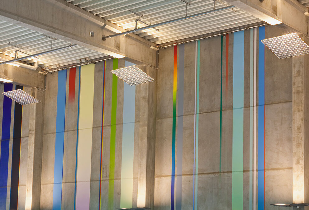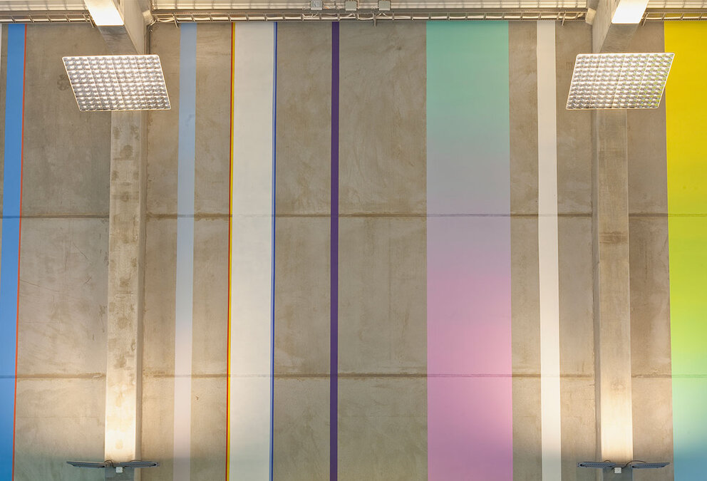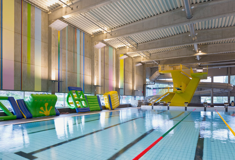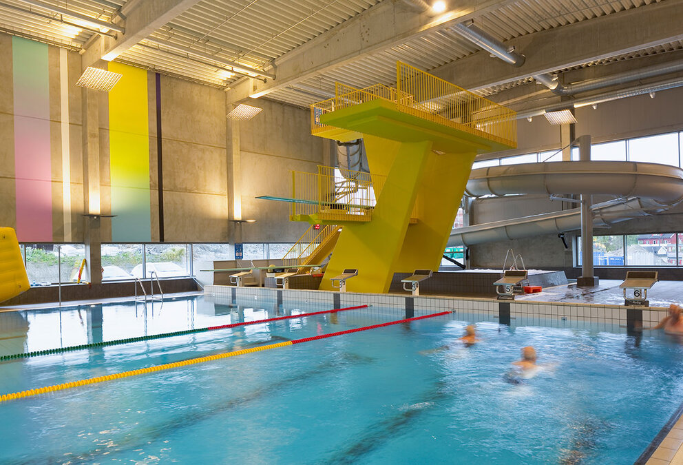 It is what the city of Årnes has been waiting for since the 1980s: a new swimming pool was built right next to the long-established sports complex. The family-friendly design of the indoor pool features walls made of plain, unpainted concrete with colored sections on the long side, combined with a yellow diving tower. The perfect lighting for showcasing the clean architecture peppered with color accents: the lighting solution with a Floodlight FL 20 and the Mirrortec® secondary reflector system. The narrow silhouette of the floodlight is easily integrated, while the indirect light creates a friendly atmosphere.
