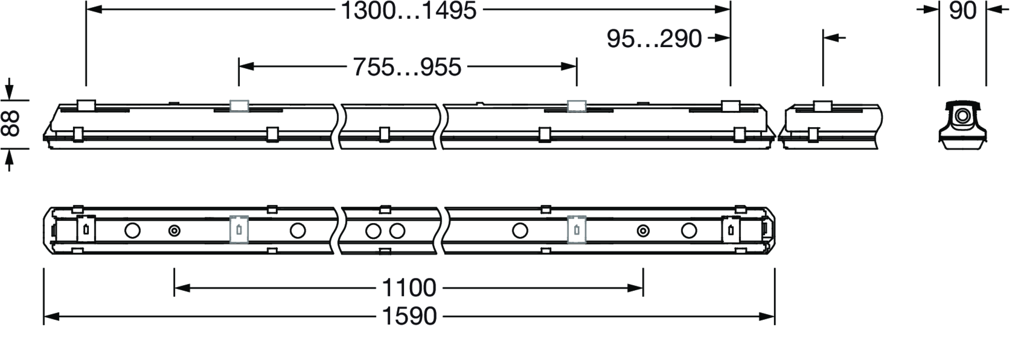 LED, Einzelbatterie-Element, Abdeckwanne, nach unten, abgehängte Montage, Anbau, horizontale Montage, vertikale Montage, L= 1590mm