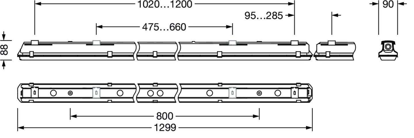 Monsun 21 parking, Feuchtraumleuchte, Kettenabhänger, primäre lichttechn. Abdeckung: Abdeckwanne, aus PC, Lichtaustritt: direkt strahlend, primäre Lichtcharakteristik: symmetrisch, Montageart: abgehängte Montage, Anbau, horizontale Montage, vertikale Montage, LED, Bemessungslichtstrom: 3.850lm, Lichtausbeute: 160lm/W, Lichtfarbe: 840, Farbtemperatur: 4000K, Vorschaltgerät: DALI 2, mit Klemme, 5polig, max. 2,5mm², Netzanschluss: 220..240V, AC, 50/60Hz, Bemessungsleistung: 24W, Gehäuse, aus Kunststoff, glasfaserverstärkt, unbehandelt, hellgrau, inkl. Kettenabhänger, robuste Gehäuseausführungen für den Einsatz im Innen- und im Semi-Außenbereich, Länge: 1.299mm, Breite: 90mm, Höhe: 88mm, Abdeckwannen-Verschluss, aus Edelstahl (V2A), Deckenmontage-Element, aus Edelstahl (V2A), Kettenabhänger, aus Edelstahl (V2A), Schutzart (gesamt): IP66, Schutzklasse (gesamt): SK I (Schutzerdung), Prüfzeichen: CE, ENEC, VDE, UKCA, Schutzzeichen: D, Schlagfestigkeit: IK08, zul. Betriebsumgebungstemperatur: -25..+35°C, Norm: EN 50419, EN 60598-2-1, entspricht den Anforderungen von IFS (International Featured Standards) für Sicherheit und Qualität in der Lebensmittelindustrie, für Innen- oder überdachte Außenmontage, keine direkte Beschneiung, keine direkte Sonnenbestrahlung, kein direkter Regen, LABS-Konformität geprüft gemäß VDMA 24364:2018-05, Kontaktieren Sie ihren Verkaufsberater, bevor Sie die Leuchten in Anwendungen mit unklarer chemischer Belastung, großen Temperaturschwankungen oder kondensatbildender Luftfeuchtigkeit einsetzen, Verpackungseinheit: 1 Stück