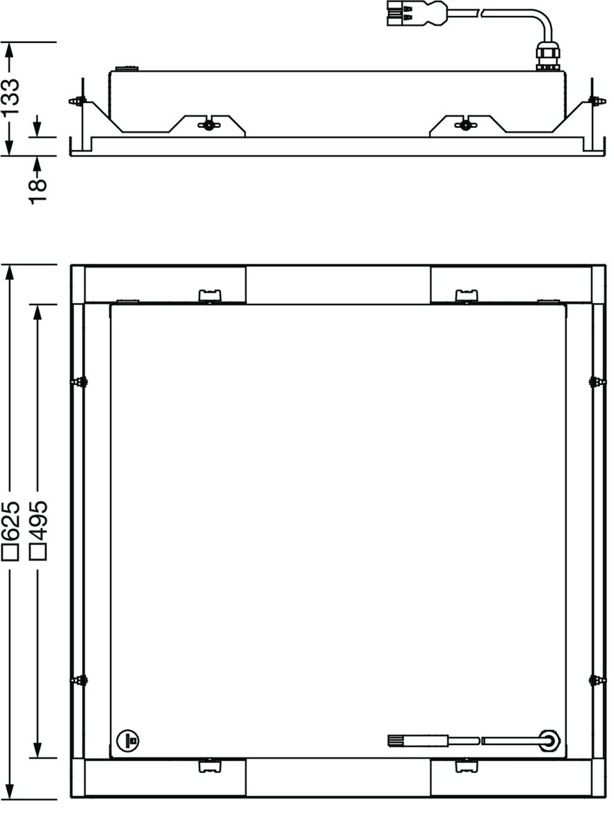 Mira 11 SL, Reinraumleuchte, primäre Lichtlenkung mit Reflektor, primäre lichttechn. Abdeckung: Abdeckung, aus PC, Lichtaustritt: direkt strahlend, primäre Lichtcharakteristik: symmetrisch, Montageart: Einbau, LED, Bemessungslichtstrom: 4.430lm, Lichtausbeute: 111lm/W, Lichtfarbe: 840, Farbtemperatur: 4000K, Vorschaltgerät: EIN/AUS, mit Klemme, 3polig, max. 2,5mm², Netzanschluss: 230V, AC, 50/60Hz, Bemessungsleistung: 40W, Leuchtengehäuse, aus Stahlblech, lackiert, reinweiß (RAL 9010), mit Flügelmuttern, Modul: M625, Länge: 623mm, Breite: 623mm, Höhe: 91mm, Schutzart (gesamt): IP54, Schutzart (raumseitig): IP65, Schutzklasse (gesamt): SK I (Schutzerdung), Prüfzeichen: CE, UKCA, zul. Betriebsumgebungstemperatur: -5..+40°C, Norm: EN 50419, Verpackungseinheit: 1 Stück