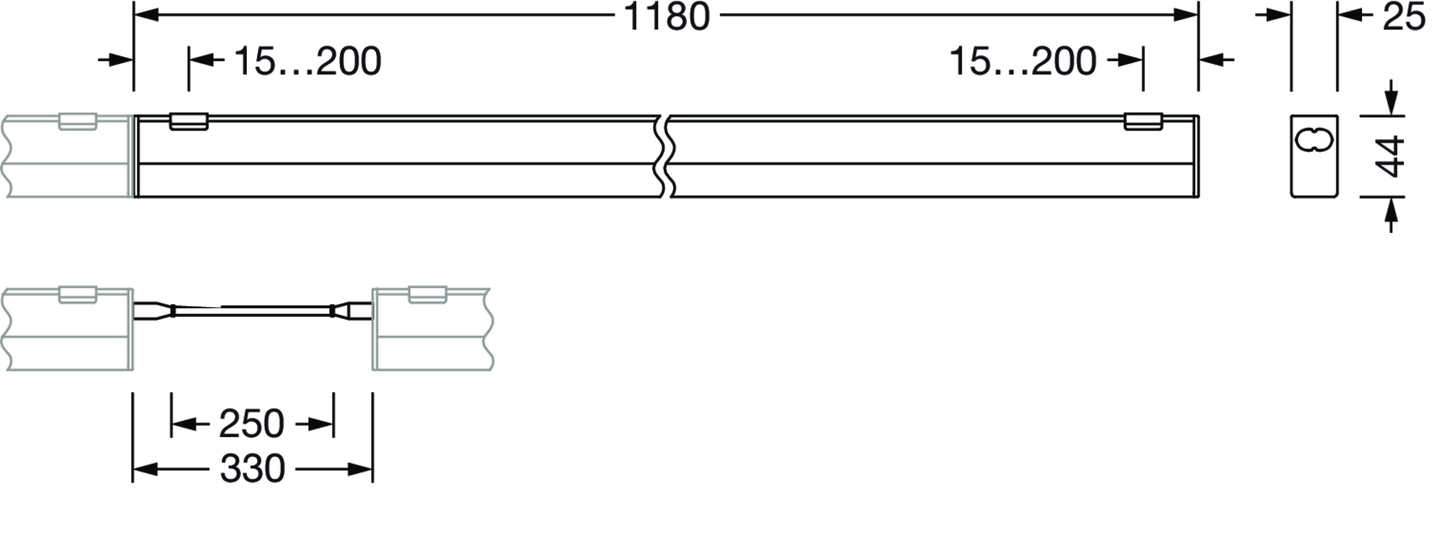Batten 41-E, Lichtleiste, primäre lichttechn. Abdeckung: Abdeckung, aus PC, satiniert, Lichtaustritt: direkt strahlend, primäre Lichtcharakteristik: symmetrisch, Montageart: Anbau, LED, Bemessungslichtstrom: 2.000lm, Lichtausbeute: 125lm/W, Lichtfarbe: 830/840/850, Farbtemperatur: 3000/4000/5000K, Vorschaltgerät: EIN/AUS, mit Systemverbindung: Buchse, Netzanschluss: 220..240V, AC, 50/60Hz, Bemessungsleistung: 16W, Gehäuse, aus Aluminium, silber, Länge: 1.180mm, Breite: 25mm, Höhe: 44mm, Stirnwand, aus PC, weiß, Schutzart (gesamt): IP20, Schutzklasse (gesamt): SK II (Schutzisoliert), Prüfzeichen: CE, zul. Betriebsumgebungstemperatur: -20..+40°C, Verpackungseinheit: 1 Stück
