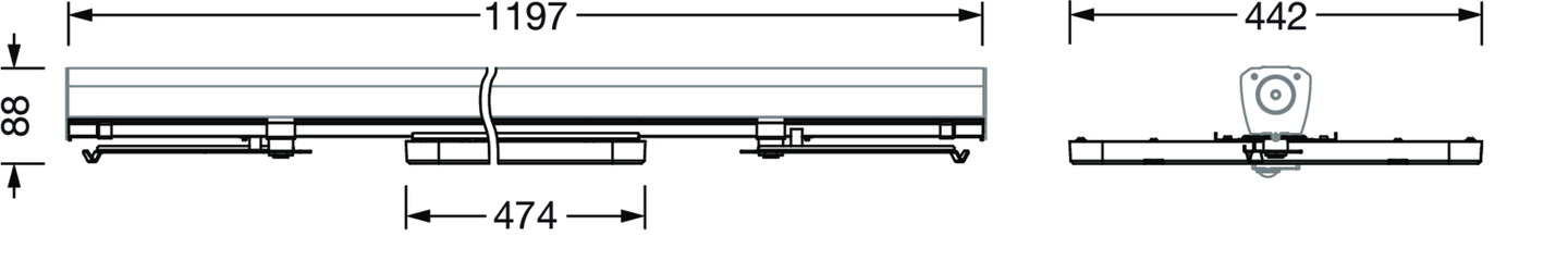 high bay luminaire Highbay 21 for Modario trunking rail midi; direct symmetric wide distribution, light control with lens of PMMA; UGR ≤ 22 (X = 4H | Y = 8H | S = 0.25H | reflection values 70/50/20); luminous flux: 13.620lm; light colour: 850, colour temperature: 5000K, MacAdam ≤ 3 SDCM (initial), colour rendering: CRI > 80; luminous efficacy: 188,9lm/W; rated service life: 75.000h (L80) at AT= ta max; control: DALI 2; luminaire connection: plug, 5-pole, with phase selectionmains connection: 230..240V, AC 50/60Hz; connected load: 72,1W; protection rating (complete): IP20; insulation class (complete): insulation class I (protective earthing); protection symbol: D; impact resistance: IK06; certification: CE, UKCA; internal wiring halogen-free; luminaire LABS conformity tested according to VDMA 24364:2018-05; Suitable for use in the food industry according to the specifications of IFS-Food, HACCP and/or BRC; housing frame of high-performance plastic PA6, matt traffic white (RAL 9016); cover of PMMA; fixing on rail side of steel, galvanised, white; blank cover of PC, traffic white (RAL 9016); dimension (LxWxH): 1.195 x 442 x 72mm; permissible operating ambient temperature: -40..+55°C (reducing of maximum allowable ambient temperature of 5°C with ceiling mounting); packaging unit: 1 piece