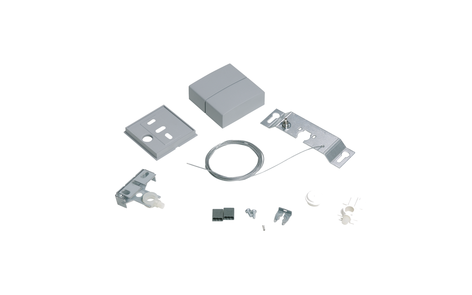 Comfit M, Doppel-Seilabhängung, mit mit 5 Klemmen, 1polig, max. 2,5mm², Deckenbefestigungselement, aus Stahl, verzinkt, Baldachin, eckig, aus Kunststoff, Seil, aus Stahl, verzinkt, leuchtenseitiger Tragbügel, aus Stahl, verzinkt, Verpackungseinheit: 1 Stück