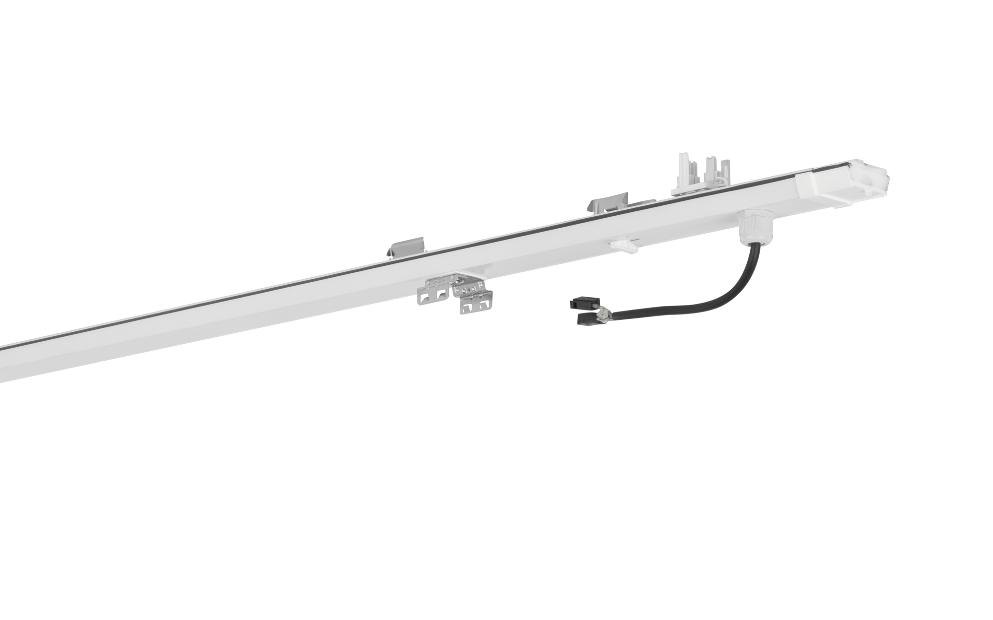 Monsun 11 Extreme, Schieneneinsatz, Leuchten-Montage-Einsatz, mit System­verbindung Leuchte: Buchse, 5polig; für Modario Tragschiene, 10adrig, Netz­anschluss: 220..240V, AC/DC, 0/50..60Hz, Stirnwand, aus PC, weiß, Länge: 1.495mm, Breite: 48mm, Leuchten-Montage-Einsatz, aus Stahlblech, verzinkt, lackiert, leuchtenweiß, Schutzart (gesamt): IP64, Schutzklasse (gesamt): SK I (Schutzerdung), Prüfzeichen: CE, ENEC, VDE, UKCA, Schutzzeichen: D, Verpackungs­einheit: 1 Stück