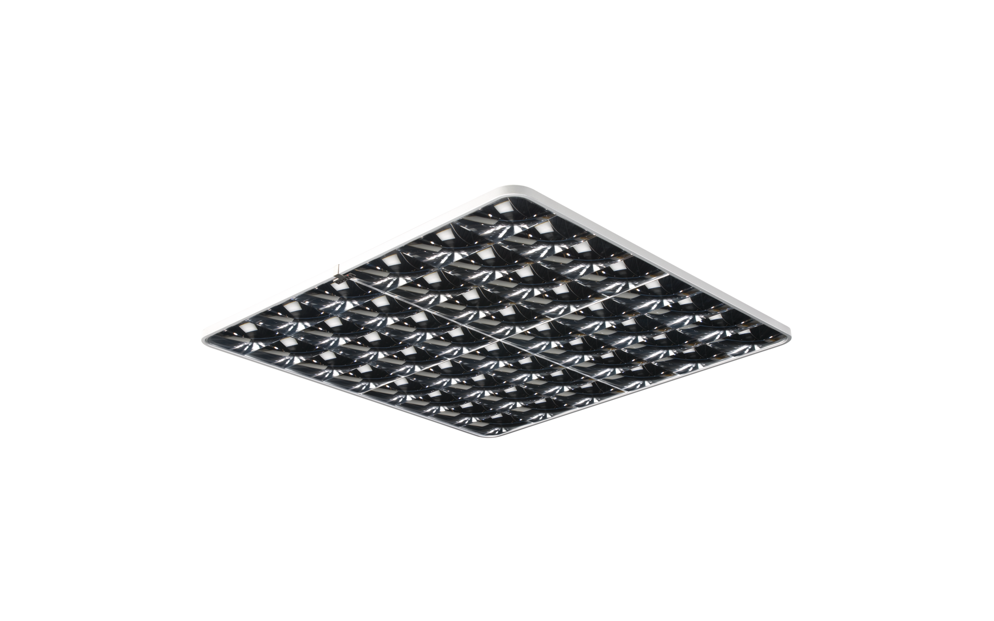 Spiegel-Werfer-Reflektor, für SITECO Mirrortec Indoor, Seilabhänger, Gehäuse, quadratisch, aus Aluminium, lackiert, weißaluminium (RAL 9006), Fresnel Reflektor 100, aus PMMA, Alu bedampft, hochglänzend, Lichtpunkt-Zerlegung, Fresnelstruktur, Länge: 600 mm, Breite: 600 mm