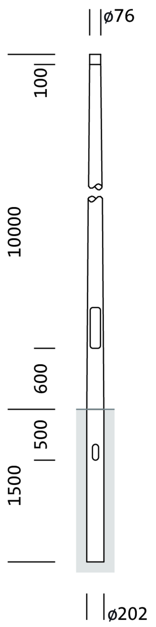 Mast, Mast, konisch rund, aus Stahl, verzinkt, Höhe: 10m, Zopfmaß: 76mm (Aufsatz), Erdstück: h= 1500mm / Ø= 202mm, Norm: DIN EN 40, Verpackungs­einheit: 1 Stück