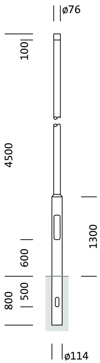 Mast, Mast, zylindrisch abgesetzt, aus Stahl, verzinkt, Höhe: 4,5m, Zopfmaß: 76mm (Aufsatz), Erdstück: h= 800mm / Ø= 114mm, Norm: DIN EN 40, Verpackungs­einheit: 1 Stück