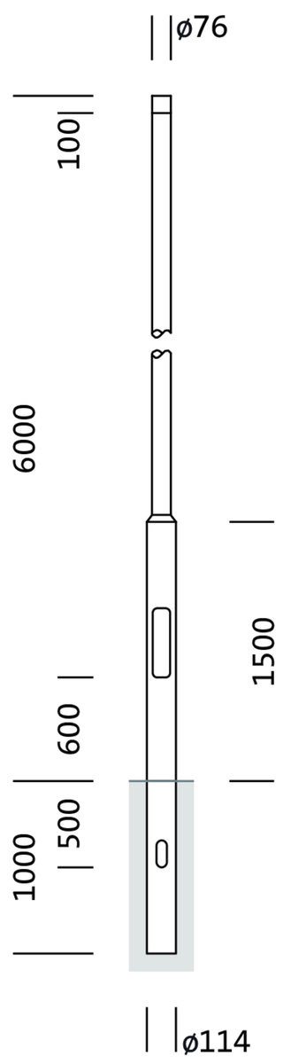 Mast, Mast, zylindrisch abgesetzt, aus Stahl, verzinkt, Höhe: 6,0m, Zopfmaß: 76mm (Aufsatz), Erdstück: h= 1000mm / Ø= 114mm, Norm: DIN EN 40, Verpackungseinheit: 1 Stück
