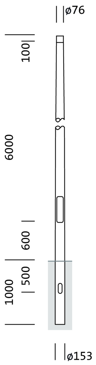 palo, palo, conico rotondo, in acciaio, verniciato con polveri, ferro micaceo Siteco® (DB 702S), altezza: 6,0m, imbocco: 76mm (su palo diritto), messa a terra: alt.= 1000mm / Ø= 153mm, norma: DIN EN 40, unità d’imballo: 1 pezzo