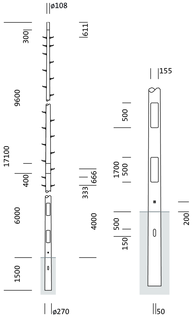 Mast, Mast mit Steigtritte, konisch rund, aus Stahl, verzinkt, Typ 1: Aufsatz, Durchmesser: 108 mm, Höhe: 16m, Zopfmaß: 108mm, Verpackungseinheit: 1 Stück