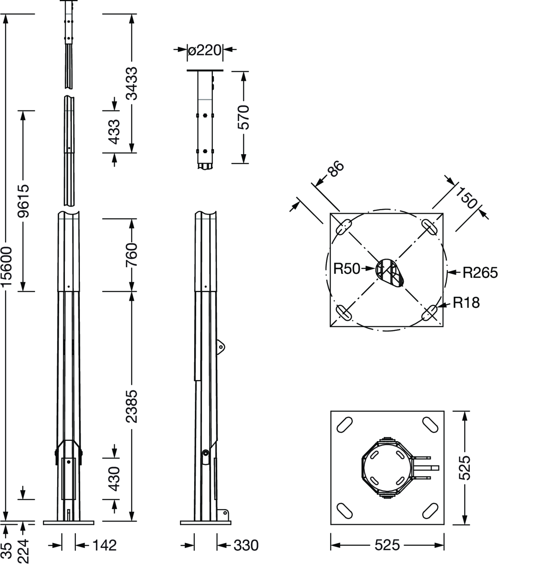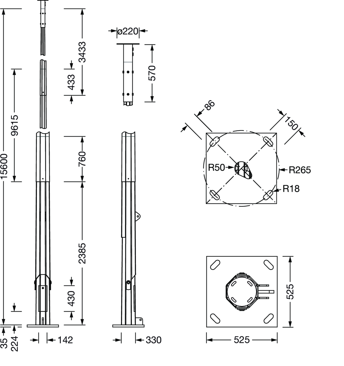 Mast, Kippmast, Montageart: Schraubbefestigung, Kippmast, aus Stahl, verzinkt, für bis zu 3 Stk. Floodlight FL 11 maxi pro in Windzone 1, für bis zu 2 Stk. Floodlight FL 11 maxi pro in Windzone 2, Höhe: 15,6m, Masttüre, aus Stahl, verzinkt, Breite: 125mm, Höhe: 410mm, Norm: DIN EN 40, Verpackungseinheit: 1 Stück