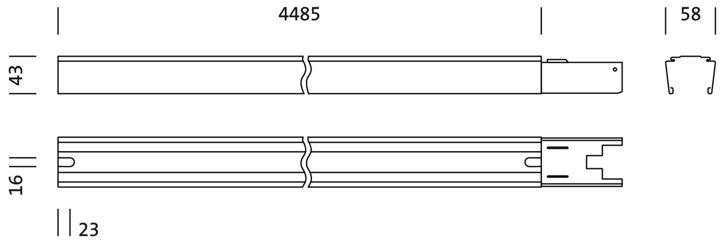 Modario, Tragschiene, aus Stahlblech, lackiert, leuchtenweiß, 3längig, Länge: 4.485 mm, Breite: 58 mm, Höhe: 43mm, Durchverdrahtung: 10x 2,5mm², mit Klemme, 10polig, max. 2,5mm², Schutzart (gesamt): für Schutzart IP20/IP40, Schutzklasse (gesamt): SK I (Schutzerdung), Prüfzeichen: CE, ENEC, VDE, Norm: EN 60598, Verpackungseinheit: 1 Stück