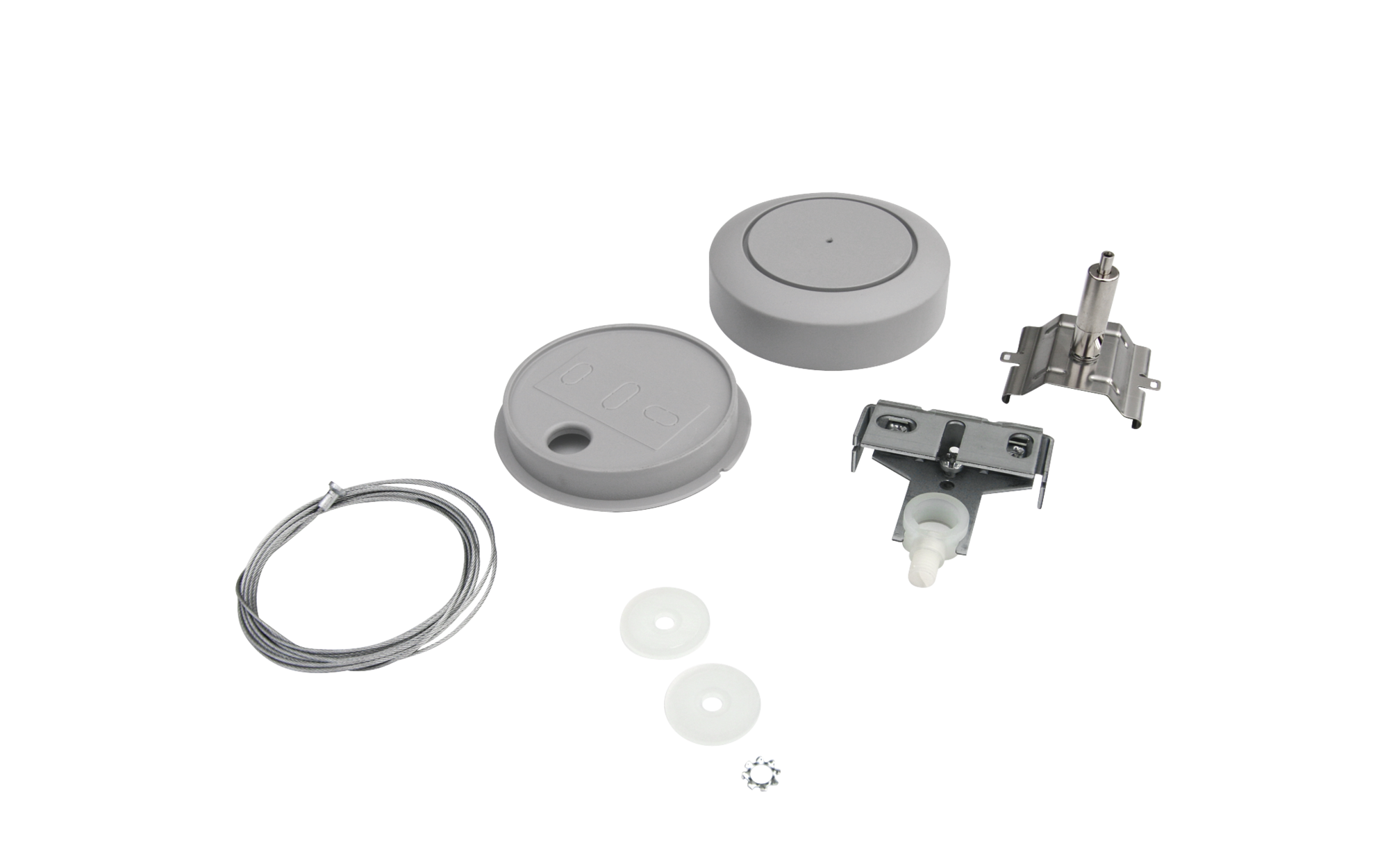 Modario, Seilabhängung, Deckenbefestigungselement, aus Stahlblech, verzinkt, Baldachin, aus Kunststoff, Seil, aus Stahl, verzinkt, schienenseitige Befestigung, aus Federstahl V2A, Verpackungs­einheit: 1 Stück