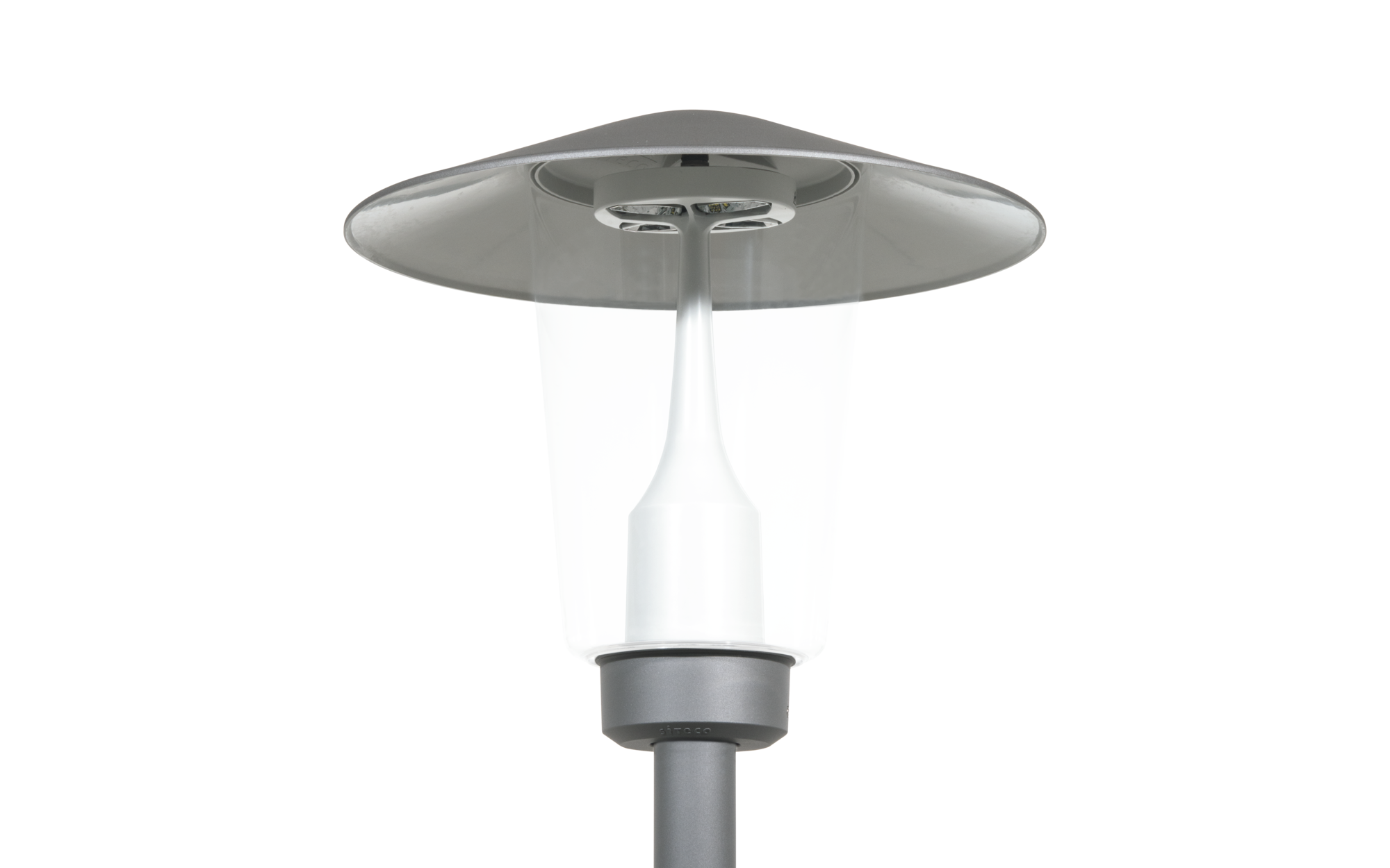 Pilzleuchte iQ, Mastleuchte, Modul 540 iQ-SR, primäre Lichtlenkung mit 3-Zonen Facetten-Reflektor, aus Kunststoff, Silber beschichtet, hochglänzend, strukturiert, primäre lichttechn. Abdeckung: Abdeckung, aus PMMA, klar, Licht­verteilung: C120005, Abstrahlwinkel primär: breit strahlend, Lichtaustritt: direkt strahlend, primäre Licht­charakteristik: symmetrisch, Montageart: Aufsatz, Leuchtmittel: LED, Bemessungswerte: 3.000lm | 18,5W | 162,2lm/W (Beginn Lebensdauer); Ende Lebensdauer: 3.000lm | 19,7W; bei 50% Lichtstrom: 1.500lm | 9,3W | 161,3lm/W, Farb­temperatur: 4000K, Farb­wiedergabe: CRI > 70, Lichtfarbe: 740, Lichteinstellung 1 (weitere Lichteinstellungen möglich): 100% | 3.000lm | 18,5W | 162,2lm/W | 4.000K (Beginn Lebensdauer); Ende Lebensdauer: 19,7W, Vorschaltgerät: iQ Street-Remote, Steuerung: Voreinstellung: Dimmkennlinie logarithmisch, Street-Remote, Auto-Match, Temp-Guard, Lumen-Switch, Night-Set, Smart-Wire, Light-Fading, Desk-Remote (drahtloses, spannungsfreies Auslesen und Einstellen der iQ-Features in der Werkstatt via anwendungsoptimierter NFC-Funktion/RFID-Funktion), optimierte Konstant­licht­strom­steuerung (CLO 2.0), Netz­anschluss: 220..240V, AC, 50/60Hz, Stoßspannungsfestigkeit: Stoßspannungsfestigkeit: 10kV (Common Mode); 6kV (Differential Mode), Elektrischer Anschluss: Klemme, 6polig, max. 2,5mm², eindrähtig, feindrähtig, Leuchten­gehäuse-Oberteil, aus Polyester, glas­faser­verstärkt, lackiert, SITECO eisenglimmer (DB 702S), Durchmesser: 650mm, Höhe: 586mm, für Zopfmaß: d x l = 76 x 70mm (Aufsatz) | mit Reduzierstück (optionales Zubehör) 60 x 70mm, Mastaufsatzelement, aus Aluminium-Druckguss, lackiert, SITECO eisenglimmer (DB 702S), Modul 540 iQ-SR, verkehrsweiß matt (RAL 9016), Ausstattung: Standard, Schutzart (gesamt): IP65, Schutzklasse (gesamt): SK II (Schutzisoliert), Prüfzeichen: CE, ENEC, VDE, Verpackungs­einheit: 1 Stück