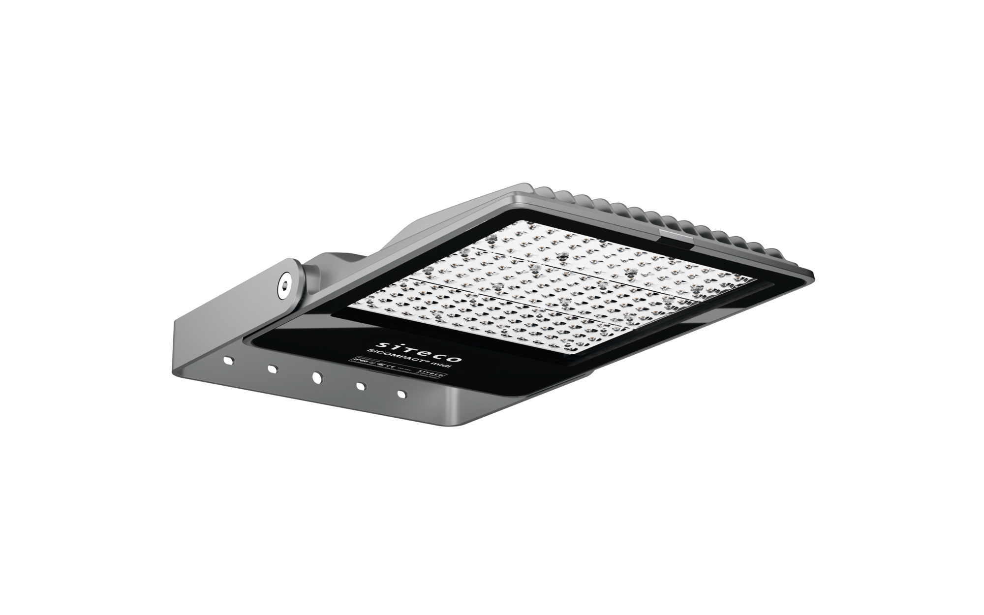 SiCompact 31 midi, Fluter, primäre Lichtlenkung mit Linse, aus Kunststoff, aus Einscheiben-Sicherheitsglas, klar, Licht­verteilung: PL32, Lichtaustritt: direkt strahlend, primäre Licht­charakteristik: asymmetrisch, Montageart: Anbau, LED, High Power LED, Bemessungs­lichtstrom: 37.000lm, Licht­ausbeute: 148lm/W, Lichtfarbe: 730, Farb­temperatur: 3000K, Vorschaltgerät: EIN/AUS, mit Leitung, 3x 1,5mm², Netz­anschluss: 220..240V, AC, 50/60Hz, Anschluss­leitung vormontiert, Leitungslänge: 2m, Bemessungs­leistung: 250W, aus Aluminium-Druckguss, glänzend, weißaluminium (RAL 9006), Länge: 560mm, Breite: 330mm, Höhe: 62mm, Bügel, aus Stahlblech, lackiert, weißaluminium (RAL 9006), EIN/AUS, Schutzart (gesamt): IP66, Schutzklasse (gesamt): SK I (Schutzerdung), Prüfzeichen: CE, ENEC, Schlag­festigkeit: IK08, zul. Betriebsumgebungstemperatur: -40..+45°C, Verpackungs­einheit: 1 Stück