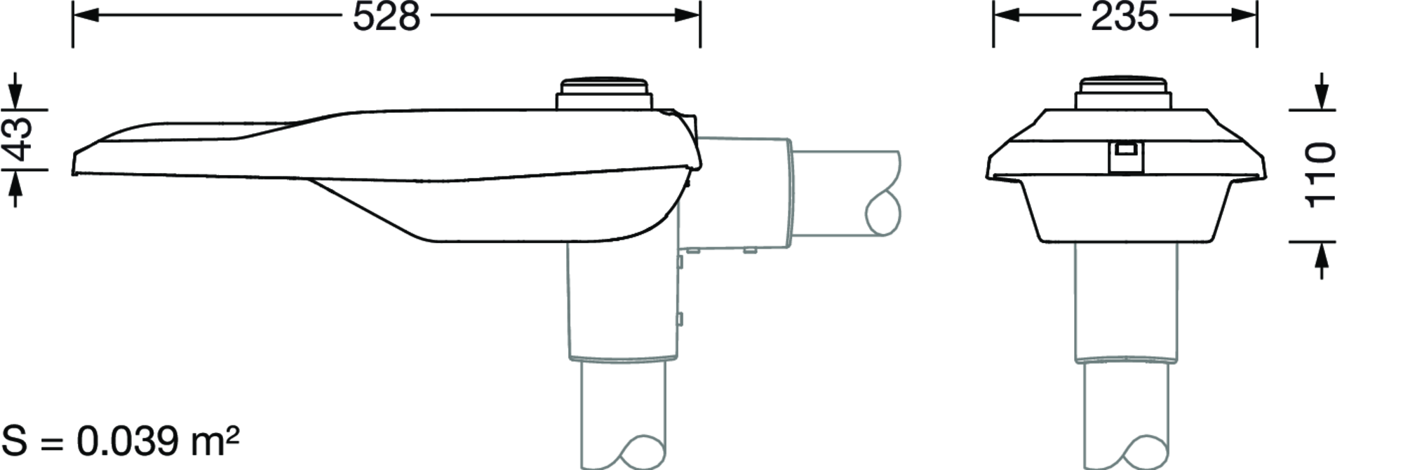 Streetlight SL 21 micro, mast luminaire, primary light control with lens, of PMMA, primary optical cover: cover, of toughened safety glass, transparent, light distribution: A520002, primary beam angle: wide distribution, light emission: direct distribution, primary light characteristic: asymmetric, installation type: post-top, lamps: LED, rated values: 5.020lm | 39,1W | 128,4lm/W (begin service life); end service life: 5.020lm | 40,8W; at 50% lumin. flux: 2.517lm | 17,7W | 142,2lm/W, colour temperature: 3000K, colour rendering: CRI > 70, light colour: 730, light setting 1 (further light settings possible): 100% | 5.020lm | 39,1W | 128,4lm/W | 3.000K (begin service life); end service life: 40,8W, control gear: NEMA (7pin), control: overheat protection, pre-setting: linear dimming characteristic, constant luminous flux control, time-dependent luminous flux control, flexible luminous flux parameterisation, mains connection: 230..240V, AC, 50/60Hz, surge voltage resistance: surge voltage resistance: 10kV (common mode); 6kV (differential mode), connection cable: pre-assembled, cable length: 6,5m, wiring characteristics: H07RN-F, 3G 1,5mm², configuration: L/N/PE, luminaire housing, of diecast aluminium (EN AC-44300), powder-coated, SITECO metallic grey (DB 702S), corrosivity category C5 high according to DIN EN ISO 12944, multi-level sealing system, sealing non-destructively replaceable, inclination adjustable: 0°, 5°, 10°, 15°, length: 528mm, width: 235mm, height: 110mm, spigot size: 76/60mm (post-top), Smart Interface above: NEMA (7pin), protection rating (complete): IP66, insulation class (complete): insulation class I (protective earthing), certification: CE, ENEC, ENEC+, VDE, impact resistance: IK10, permissible operating ambient temperature for outdoor applications: -40..+50°C, standard-compliant lighting for roads and squares, packaging unit: 1 piece