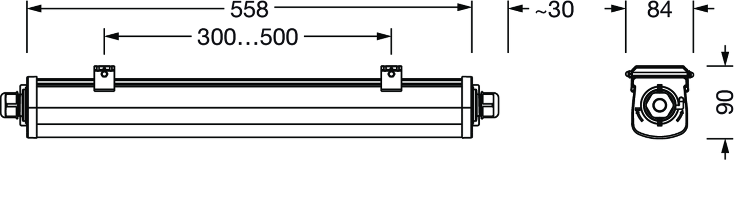 LED, EVG, mit Durchverdrahtung 3x 2,5mm² + 1x 1,5mm², Diffusor, Anbau, L= 558mm
