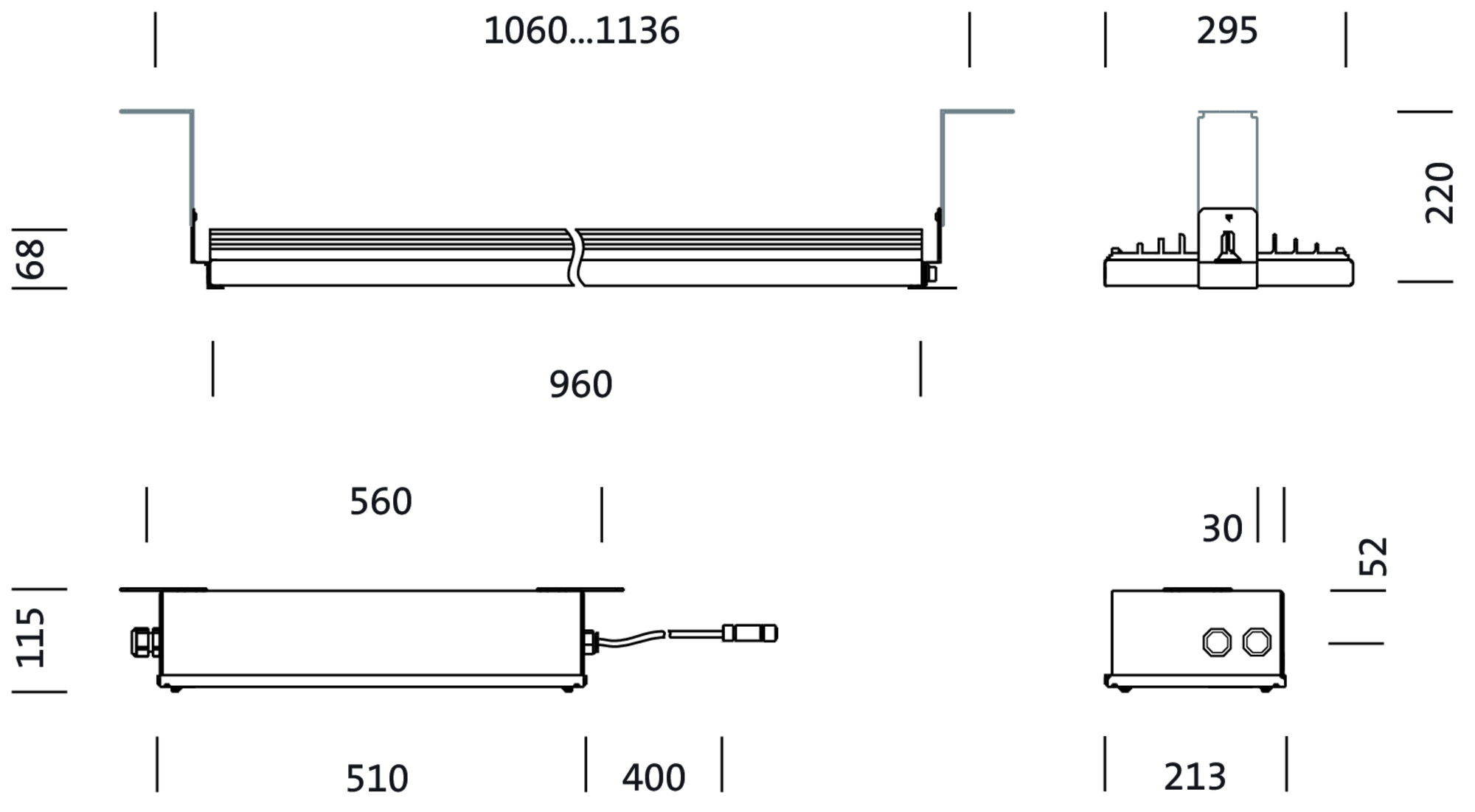TL 33C midi, tunnel luminaire, primary light control with counter beam optics, primary optical cover: cover panel, of toughened safety glass, non-reflecting, transparent, light emission: direct distribution, primary light characteristic: asymmetric, installation type: surface-mounted, connection on control gear side,LED, High Power LED, rated luminous flux: 43.770lm, luminous efficacy: 153lm/W, light colour: 740, colour temperature: 4000K, control gear: DALI, with system connector, mains connection: 220..240V, AC, 50/60Hz, connection cable plug integrated into luminaire housing at face end, rated input power: 287W, connection on mains side,7-pole, max. 10mm² (5G+2), with terminal, luminaire housing, of stainless steel 1.4404 (AISI316), etched and passivated, length: 960mm, width: 295mm, height: 68mm, heat sink, of Al Mg 2, e-box, of stainless steel 1.4404 (AISI316), etched and passivated, length: 510mm, width: 213mm, height: 115mm, protection rating (complete): IP66, insulation class (complete): insulation class I (protective earthing), certification: CE, impact resistance: IK09, permissible operating ambient temperature: -25..+55°C, packaging unit: 1 piece