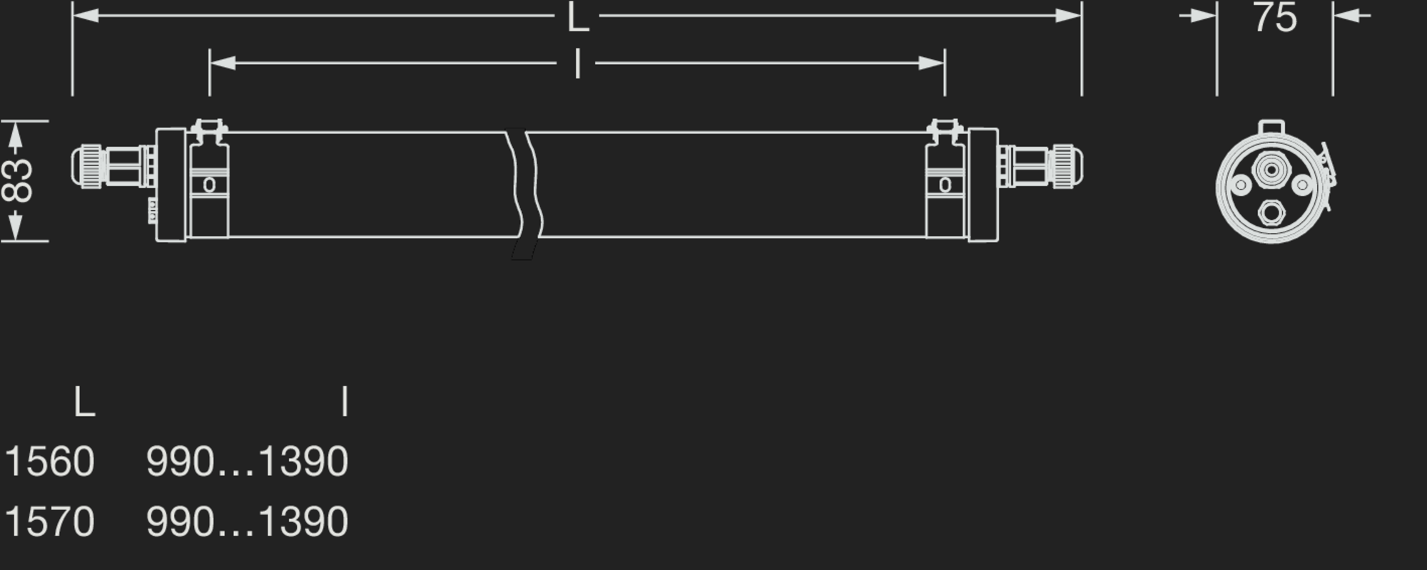 | Farbtemperatur | Farbwiedergabe | Lichtstrom | Anschlussleistung | Lichtausbeute | Steuerung | Durchverdrahtung | ta | Schlagfestigkeit | L (mm) | Gew. (kg) |