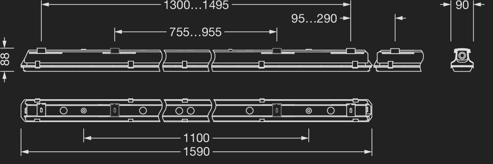 | 4000K | CRI > 80 | 12110lm | 64W | 190lm/W | DALI 2 | -40..+35°C | IK04 | 1590 | 2.5 |
