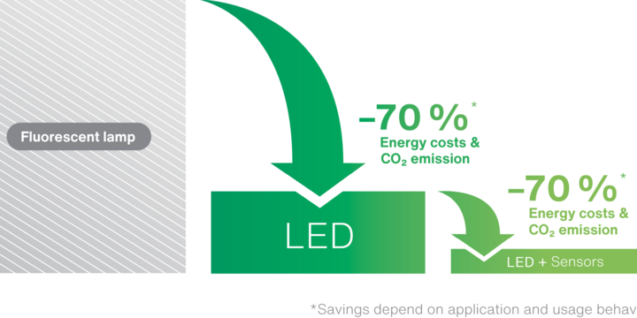 In view of the constant increase in costs, saving energy has never been as worthwhile as it is today. By refurbishing your lighting system, you can optimise your energy consumption and significantly reduce your CO2 emissions. You can save up to 80 per cent of your energy costs immediately – an investment that quickly pays for itself.