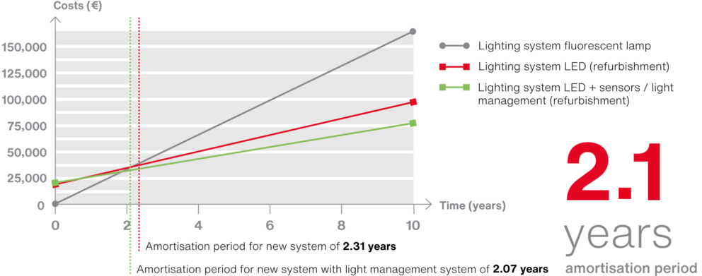 In view of the constant increase in costs, saving energy has never been as worthwhile as it is today. By refurbishing your lighting system, you can optimise your energy consumption and significantly reduce your CO2 emissions. You can save up to 80 per cent of your energy costs immediately – an investment that quickly pays for itself.